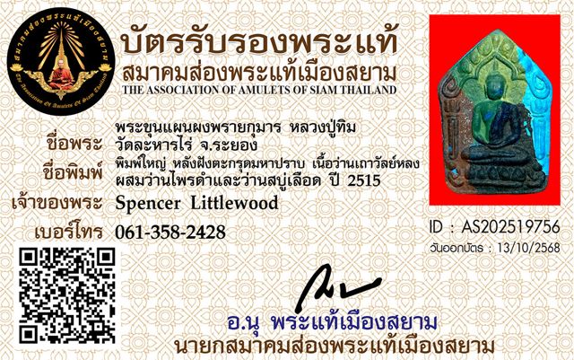 พระขุนแผนผงพรายกุมาร องค์ครู หลังฝังตะกรุดมหาปราบเนื้อทองคำ หลวงปูทิม วัดละหารไร่ 2515 พร้อมบัตรรับรอง